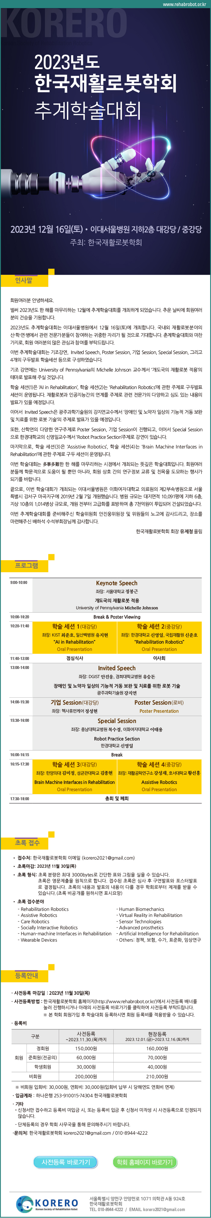 안녕하세요. 한국재활로봇학회 사무국입니다. 1. 귀 기관의 무궁한 발전을 기원합니다. 2. 우리 학회에서는 오는 2023.12.16.(토) 2023년 추계학술대회를 개최합니다.
