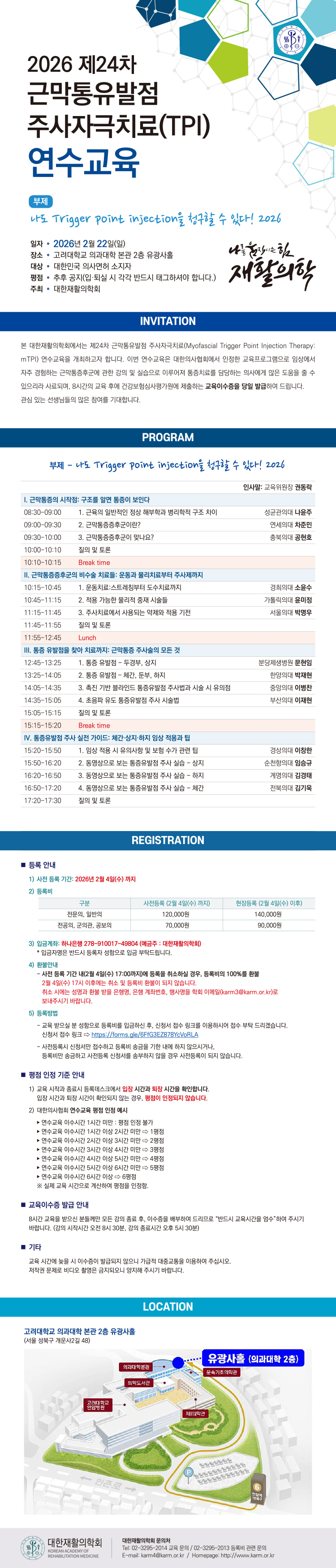 ◯ 행 사 명 : 제24차 근막통유발점 주사자극치료(TPI) 연수교육 ◯ 개최 일자 : 2026년 2월 22일(일) 08:30-17:30 ◯ 장 소 : 고려대학교 의과대학 본관 2층 유광사홀