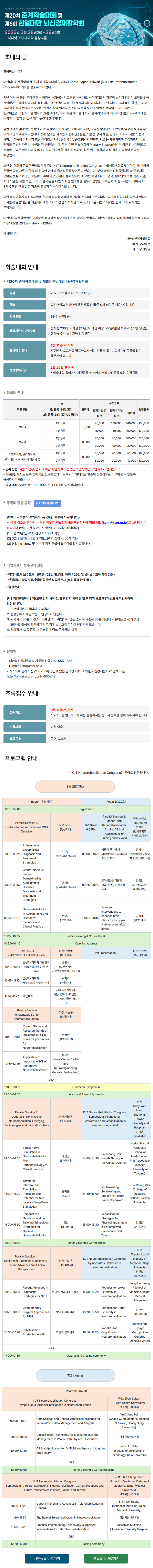 안녕하세요 대한뇌신경재활학회입니다. 귀 기관의 무궁한 발전을 기원합니다. 대한뇌신경재활학회 제20차 춘계학술대회 및 제6회 한일대만 뇌신경재활학회가 2026년 3월 28일(토)-29일(일)에 고려대학교 의과대학 유광사홀에서 개최됩니다. 공문과 함께 프로그램이 포함되어 있는 메일 발송용 이미지 파일을 보내드리오니 확인을 부탁드립니다. 항상 우리 학회에 많은 도움을 주셔서 감사합니다. <대한뇌신경재활학회 제20차 춘계학술대회 및 제6회 한일대만 뇌신경재활학회> - 일자: 2026년 3월 28일(토)-29일(일) - 장소: 고려대학교 의과대학 유광사홀(서울특별시 성북구 개운사2길 48) - 등록 안내: https://www.ksnr.or.kr/abstract/2026_spring/intro.html - 사전 등록 기간: ~3월 20일(금)까지 - 초록 접수 기간: ~3월 11일(수)까지 - 등록비: ![]() - 프로그램: 첨부파일 참고